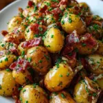 A delightful potato salad bursting with tangy flavors from vinegar and mustard, paired with crispy bacon and fresh herbs.