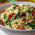 A vibrant and flavorful orzo pasta salad with feta, sun-dried tomatoes, olives, and fresh herbs, perfect for warm gatherings.