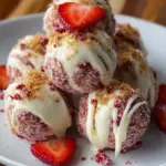 Delicious strawberry cheesecake truffles coated in white chocolate, offering a burst of flavor and texture reminiscent of summer.
